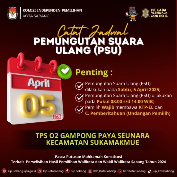 Hai #TemanPemilih Penting! PSU di TPS 02 Gampong Paya Seunara, Kecamatan Sukamakmue, Kota Sabang akan berlangsung pada hari Sabtu, Tanggal 5 April 2025. Pastikan hak pilihmu, jangan lupa cek info penting di atas!