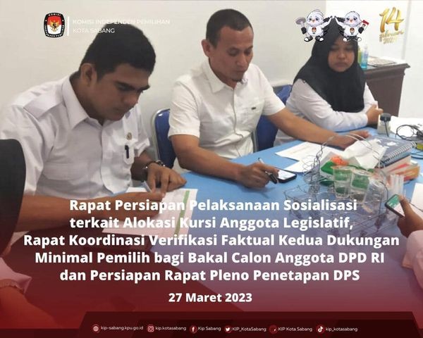 KIP Kota Sabang dalam kegiatan ini dihadiri oleh Ketua Divisi Sospenlih, Parmas dan SDM Hendra Kurniawan, S.E., Ketua Divisi Teknis Penyelenggara Muhammad Yani, S.I.P. Ketua Divisi Hukum dan Pengawasan Akmal Said, Sekretaris KIP Kota Sabang Teuku Taufiq, S.Sos, Kasubbag Tekparhubmas Azhar, S.H., M.H. serta para Staf Tekparhubmas Sekretariat KIP Kota Sabang.
