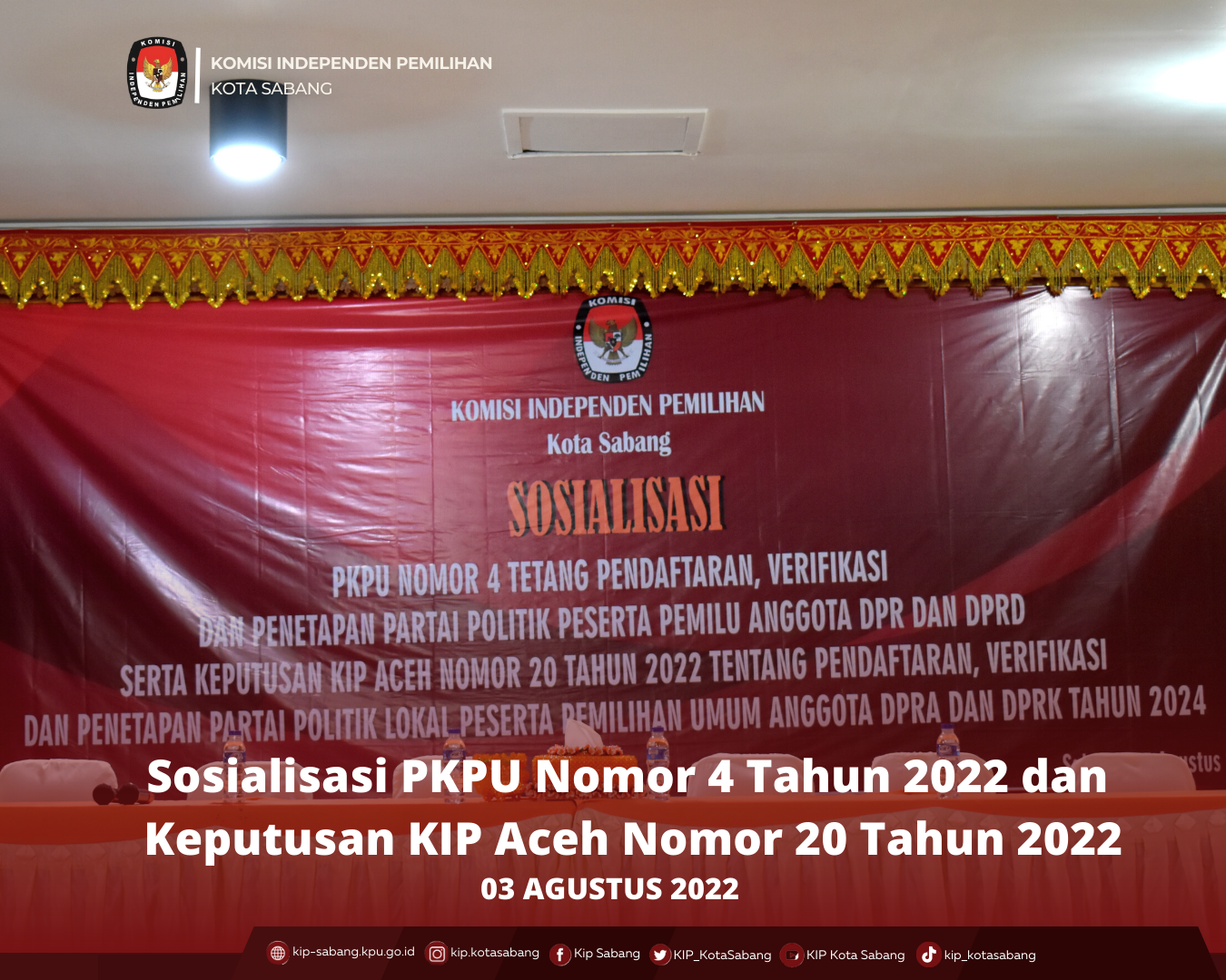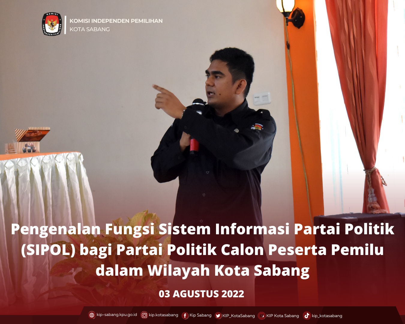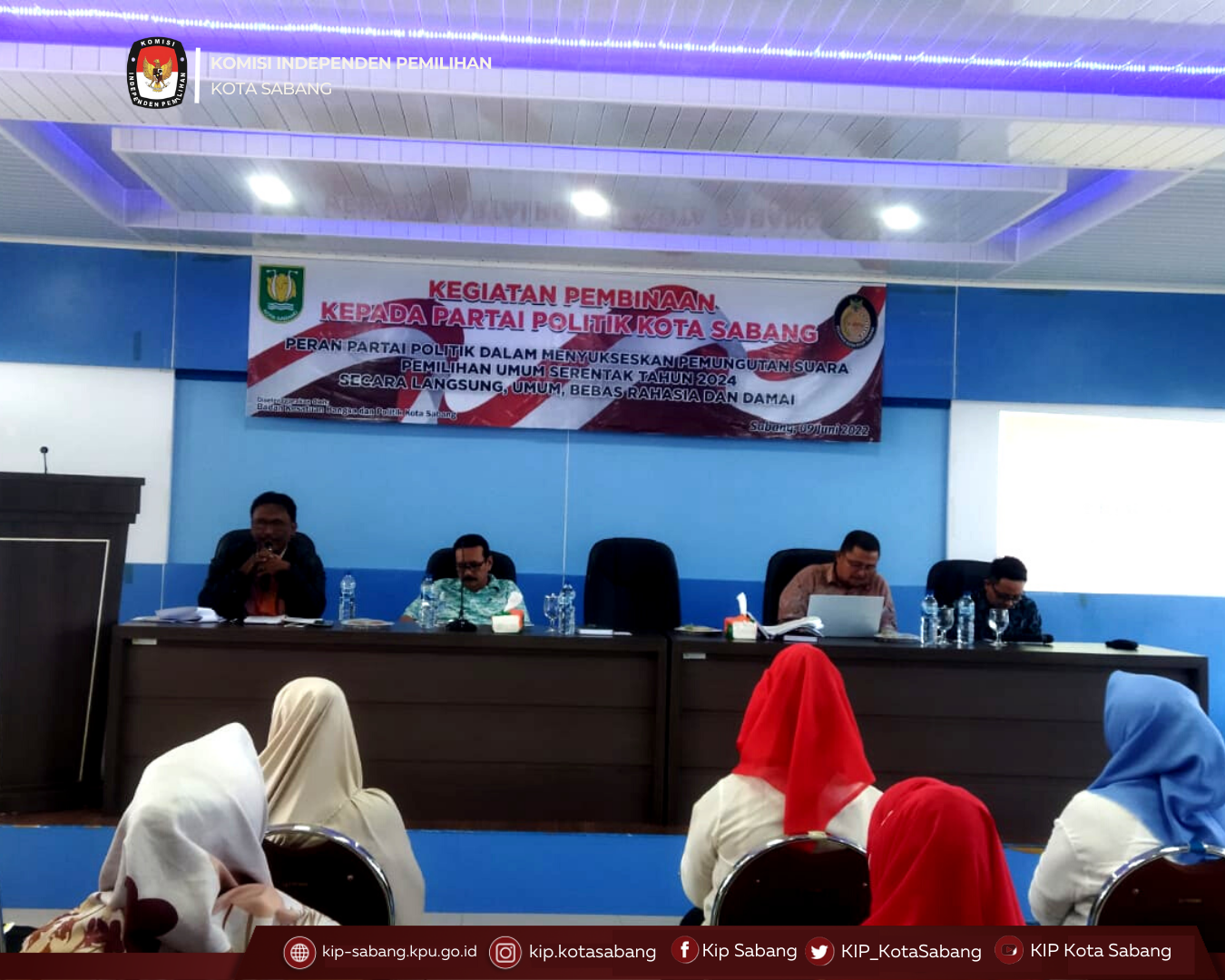 KIP Kota Sabang menyelenggarakan kegiatan sosialisasi peraturan mengenai tata cara verifikasi administrasi dan verifikasi faktual bagi partai politik calon peserta pemilu berdasarkan PKPU Nomor 4 Tahun 2022 tentang Pendaftaran, Verifikasi, dan Penetapan Partai Politik Peserta Pemilu Anggota DPR dan DPRD. Di samping itu juga disosialisasikan ketentuan peraturan terkait verifikasi administrasi dan verifikasi faktual bagi partai politik lokal calon peserta pemilu berdasarkan Keputusan KIP Aceh Nomor 20 Tahun 2022 tentang Pendaftaran, Verifikasi, dan Penetapan Partai Politik Lokal Peserta Pemilihan Umum Anggota DPRA dan DPRK Tahun 2024. Acara ini diselenggarakan di Hotel Nagoya Inn Sabang turut dihadiri oleh Panwaslih dan utusan instansi/lembaga Pemerintah Kota Sabang, Rabu (3/8/2022). Rapat yang dibuka oleh Ketua KIP Kota Sabang Azman, S.E. didampingi oleh para Anggota KIP Kota Sabang turut serta Kasubbag Teknis Penyelenggaraan Pemilu, Partisipasi dan Hubungan Masyarakat Azhar, S.H., dan seluruh ASN KIP Kota Sabang menyampaikan kesiapan KIP Kota Sabang dalam penyelenggaraan Pemilihan Umum Tahun 2024. “KIP Kota Sabang sangat siap dalam melaksanakan tahapan dan jadwal Pemilu Tahun 2024. Seperti halnya kesiapan Divisi Teknis Penyelenggara yang menjadi leading sector dari tahapan Verifikasi Partai Politik Calon Peserta Pemilu ini.” Azman menegaskan dalam kata sambutannya. Ketua Divisi Teknis Penyelenggaraan Muhammad Yani, S.I.P., menyampaikan beberapa hal penting terkait PKPU Nomor 4 Tahun 2022 dan Keputusan KIP Aceh Nomor 20 Tahun 2022 yang nantinya akan menjadi pedoman bagi penyelenggara Pemilu dalam pelaksanaan tahapan Verifikasi Partai Politik Peserta Pemilu. Diantaranya persyaratan dan dokumen persyaratan serta alur proses verifikasi administrasi dan verifikasi faktual yang akan dilakukan oleh KPU/KIP Kabupaten/Kota dalam hal ini oleh KIP Kota Sabang. “Harapan kami partai politik calon peserta Pemilu Tahun 2024 dalam wilayah Kota Sabang dapat memahami ketentuan peraturan terkait verifikasi ini dengan baik, sehingga nantinya adanya suatu pemahaman yang utuh dalam pelaksanaan tahapan verifikasi tersebut.” Ujar Muhammad Yani.