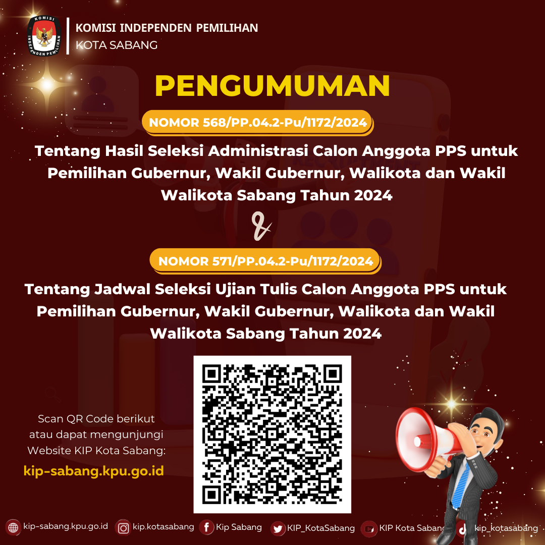 Teman Pemilih, berikut Pengumuman Nomor 550/PP.04.2-Pu/1172/2024 Tentang Hasil Seleksi Tertulis Calon Anggota PPK untuk Pemilihan Gubernur, Wakil Gubernur, Walikota dan Wakil Walikota Sabang Tahun 2024 dan Pengumuman Nomor 551/PP.04.2-Pu/1172/2024 Tentang Jadwal Seleksi Wawancara Calon Anggota PPK untuk Pemilihan Gubernur, Wakil Gubernur, Walikota dan Wakil Walikota Sabang Tahun 2024, klik link dibawah untuk mengunduh file: